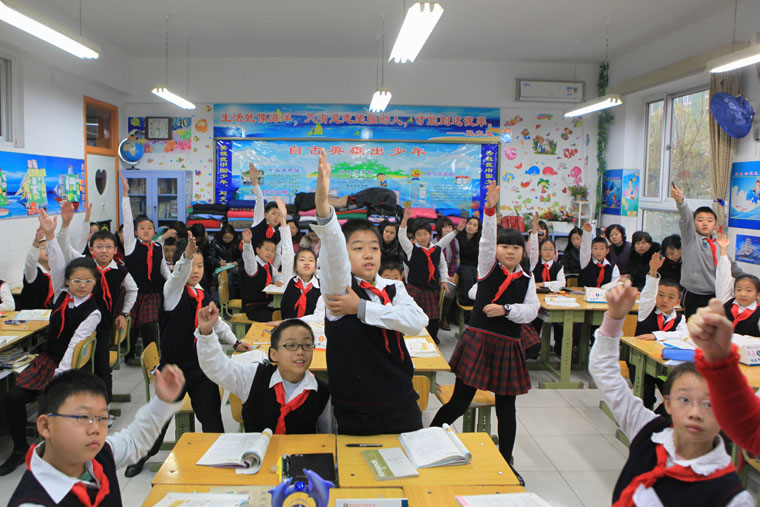 此图为:首师附小的学生在童心课堂上踊跃的表现