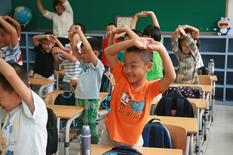 每一年新入学的一年级新生要参加入学培训。此图为:首师附小的一年级新生在课堂上进行愉快的活动
