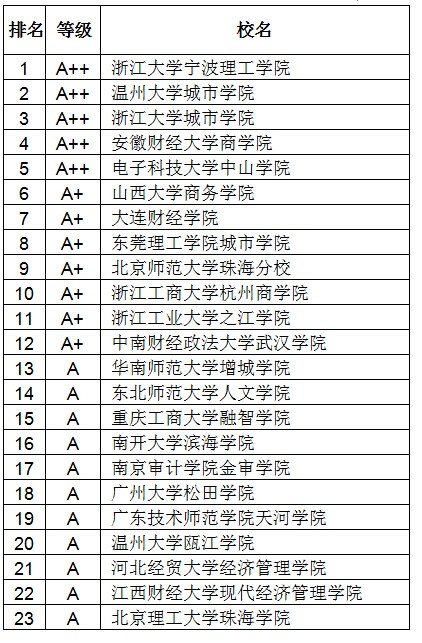 2014中国独立学院经济学A等学校排行榜