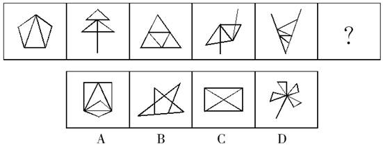 解析:图形相似度不高,所以是数量型的题目,从第一图形有三个三角形、第二个图形有四个三角形,以此类推,问号处是第六个,因此应该有八个三角形,四个选项中只有C符合,因此选C。