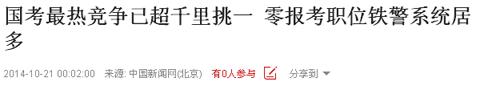 据悉,昨天报名超16万人迎来这次报名最高峰。报名人数激增,竞争比例最高的职位已达“千里挑一”,但目前仍有461个职位处于零报名状态。