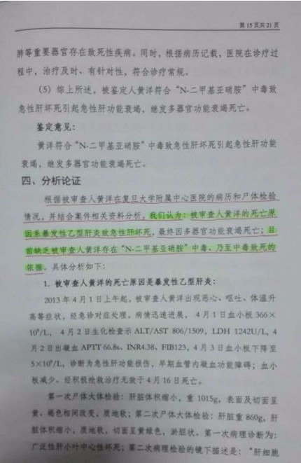 作为专业知识的人出庭的法医胡志强提出四点分析意见:一分析认为,黄洋死亡原因是爆发性乙型病毒性肝炎;二关于N—二甲基亚硝胺的检验,根据目前检测报告,认定黄洋中毒致死,缺乏依据;三病理组织检验:肝衰竭可由多种病因引起,没有绝对特异性。通过病理检测,确定死亡性质是中毒并且是特定二甲基亚硝胺中毒,是不客观不科学的;四程序问题,上海市司法鉴定中心不具备国家资格,检方鉴定程序等不合规定。