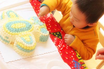 做完手工,借着做手工用的桌子,就开始给想想举办这个微型的生日Party了,虽然是微型的生日Party,但程序上一点也不含糊,点蜡烛,唱生日歌,许愿望(因为在家做游戏时我常说希望世界和平,每次他许愿望都会说:“我希望和平”)吹蜡烛,然后切蛋糕。