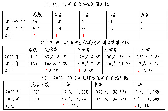 学校2009年起开始评选了“星级学生”。星级学生包括:体育之星、艺术之星、科技之星、学习之星、创作之星、体质健康之星。星期学生的评选让我们的评价尺度更加多元,多一把尺子就多一批好孩子。三年来,学生参加各级各类比赛获得国家级奖469项,市级奖336项,区级奖1074 项。体育活动见成效,学生身体素质明显提高。