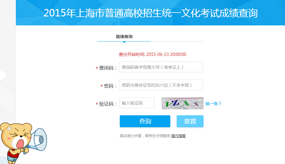 上海市高考成绩于今日20时公布。考生可于通过下列途径查询高考成绩:招考热线查询入口、东方网、新民网、易班网。考生输入本人查询码(准考证正面下方)和密码(考生本人身份证最后不含字母的六位数字),查询自己的高考成绩。