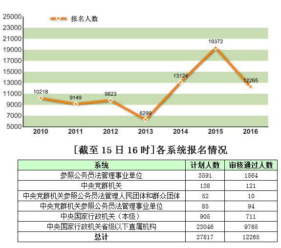 10月15日是2016国家公务员考试报名的第一天,据中公教育数据统计,从早八点开放报名到下午4点,8小时内报名系统通过审核12265人,虽不及去年同期近两万人的数据,但仍高于历年来首日报名人数的平均值。有3696个职位实现了“零的突破”,已有考生审核通过,占总职位数的24%左右。