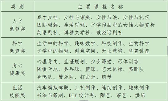 根据新课程相关文件精神,从我校办学理念、培养目标和办学特色出发,修订了《校本课程开发与实施方案》,确立了校本课程由人文素养、科学素养、身心健康、生活技能等四大类构成。初中以“自选课”为主,“必选课”为辅,满足女学生的兴趣发展,合理建构校本课程体系。不断提升学生的素质、修养,为学生打好人生的底色。