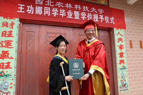伟德国际1946bv官网北京6月27日电(熊旭 杨远远)昨天,在距离西安市400多公里的商洛市柞水县杏坪镇中山村,举行了只有一名学生参加的特殊毕业典礼。身着学位服的西北农林科技大学学位委员会主席孙其信校长,顶着炎炎夏日,驱车5小时,亲手为因意外而残疾的王功娜同学拨穗、颁发学位证书,并代表学校赠送一万元慰问金。