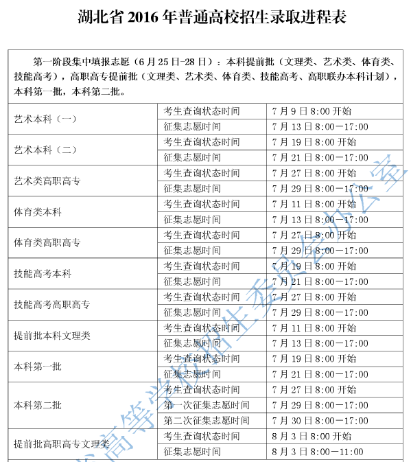 湖北:2016年普通高校招生录取进程表