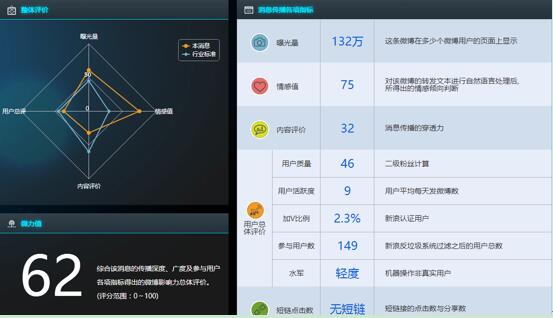 从整体分析结果来看,该条微博的曝光量达到132万,情感值达到75,内容评价达到32,用户质量值达到46,综合微力值为62。综合而言,该条微博传播路径和层级相对较少,传播地域多集中于高校所在地,受众活跃程度较低,微博情感值高,传递着正能量,具有一定的影响力。