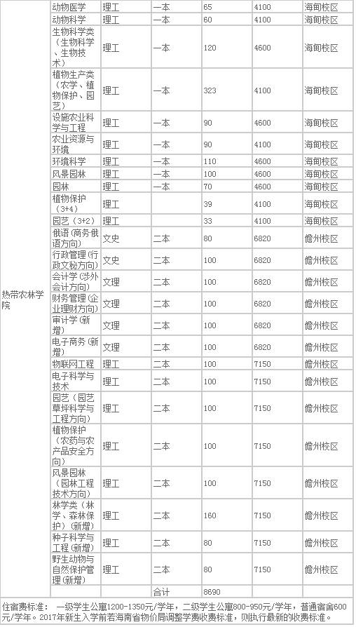 住宿费标准: 一级学生公寓1200-1350元/学年,二级学生公寓800-950元/学年,普通宿舍600元/学年。2017年新生入学前若海南省物价局调整学费收费标准,则执行最新的收费标准。