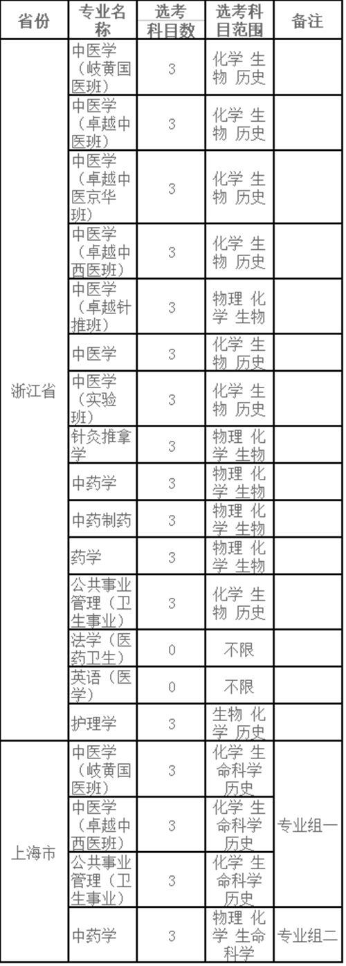 附表:北京中医药大学2017年浙江省和上海市招生专业选考科目范围