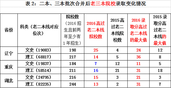 3、批次合并后录取分高于老二本线的老三本院校数量要比合并前有所增加。表中数据重庆例外,不增反减,原因是本该高过老二本线的一些老三本院校,2016年增加了不少招生计划。