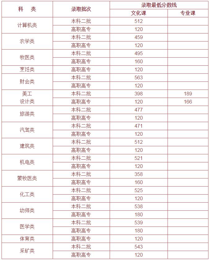各批次录取最低分数线详见下表: