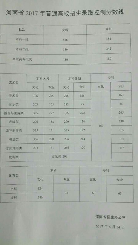 伟德国际1946bv官网郑州6月24日电 (侯琳琳)6月24日下午,记者从河南省招生办公室获悉,河南省2017年普通高校招生录取控制分数线公布,本科一批录取控制分数线:文科516分,理科 484分;本科二批录取控制分数线:文科389分,理科342分。今年本科二批与三批合并录取。专科录取控制分数线:文理科均为180分。