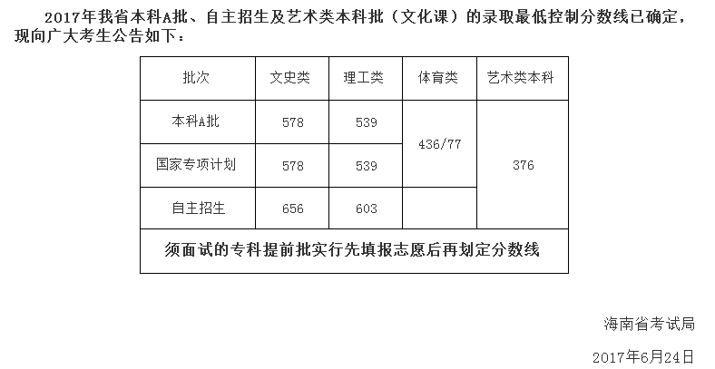2017年海南省高考分数线公布