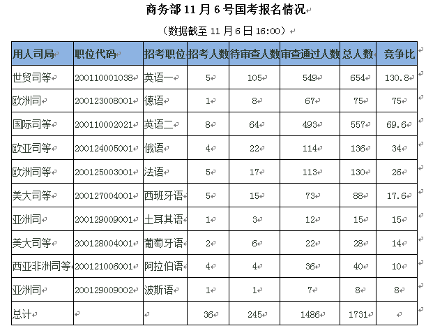 伟德国际1946bv官网北京11月7日电 (张歌)昨日是国考报名第八天,商务部报名开始步入高峰期,截至11月6日下午四点,商务部共有1731人报名,1486人通过审核,245人等待审核中。商务部今天的竞争最激烈的岗位依然是世贸司等的英语一(职位代码200110001038),最高竞争比达130.8:1。