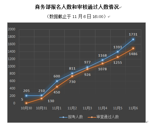 再来观察下昨日的商务部报名人数和审核人数的增长情况,通过下图我们可以发现其斜率明显变大,这也证实了国考高峰期的到来,很多考生都会在这几天下定决心,伟德国际1946bv官网教育频道建议还未报考的考生不要慌乱,结合自身情况理智选择适合自己的岗位。