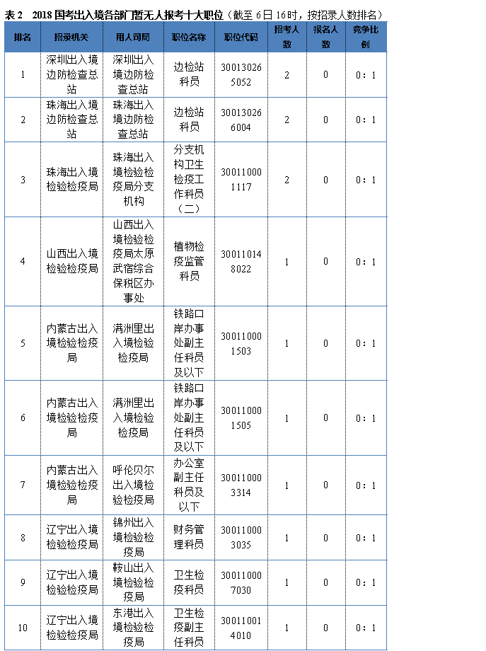 由表1可以看出,出入境各部门热门职位竞争比例最激烈的前五个部门与昨天一致,且竞争更为激烈,其中厦门出入境检验检疫局分支机构动植物检疫主任科员及以下岗位依旧是出入境各部门报名人数最多、竞争比例最高“双高”职位,竞争比例已经攀升至861:1。大亚湾出入境检验检疫局动植物检疫监管科科员岗位紧跟其后,竞争比例达到537:1。截止到目前,出入境各部门竞争比超过500:1的岗位已经达到了8个。