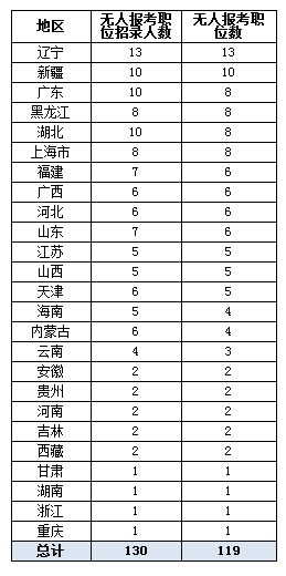 通过统计数据可以看到,工作地点在辽宁省的职位无人报名数量最多,共有13个职位,其次是西新疆和广东,而考生报考浙江、甘肃、湖南和重庆两地的“热情”相对“高涨”,只有1个职位无人报考。