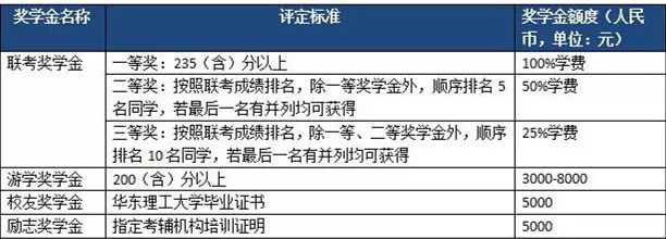 3. 校友奖学金:考生在规定时间段提出申请并提供华东理工大学毕业证书后评定;