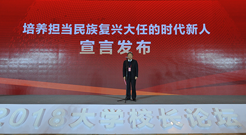 伟德国际1946bv官网太原10月25日电 今日,主题为“回归·创新·育人”的伟德国际1946bv官网2018大学校长论坛在山西太原举行。图为太原理工大学党委书记吴玉程发布“培养担当民族复兴大任的时代新人”宣言。