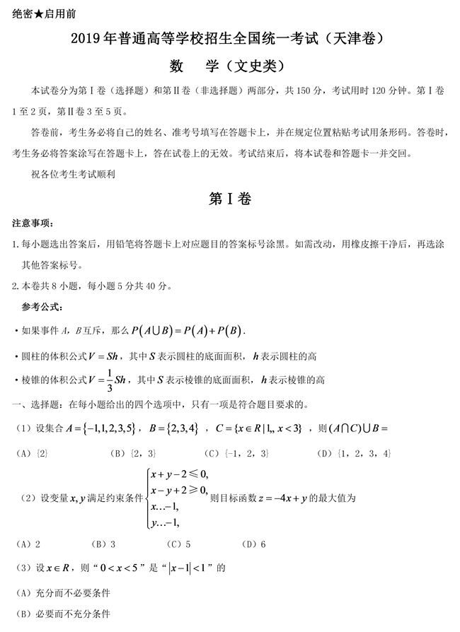 2019年天津卷文数高考试题