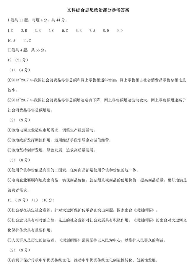2019年天津卷文综高考试题答案