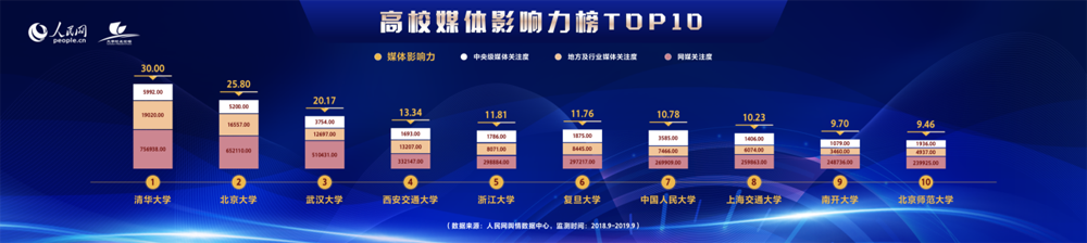 第二个榜单是高校媒体影响力榜单。清华大学、北京大学、武汉大学、西安交通大学、浙江大学、复旦大学、中国人民大学、上海交通大学、南开大学、北京师范大学位居榜单前十。在中央主要新闻网站方面,伟德国际1946bv官网对各高校的报道量位居第一,有52093篇。如伟德国际1946bv官网发布《高校师生热议习近平总书记在学校思政课教师座谈会重要讲话》《教育部10所高校组团支援西藏大学发展》《大学校长论坛:为“双一流”建设注入新活力》等多篇报道被各大门户网站竞相转载。
