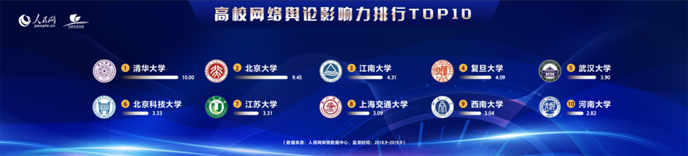 第四个榜单是高校网络舆论影响力榜单。对论坛、博客等四大平台数据进行赋值加权处理,并以四大平台数据量总和最高的学校为基准,计算出网络舆论影响力排名前十的高校分别为清华大学、北京大学、江南大学、复旦大学、武汉大学、北京科技大学、江苏大学、上海交通大学、西南大学、河南大学。
