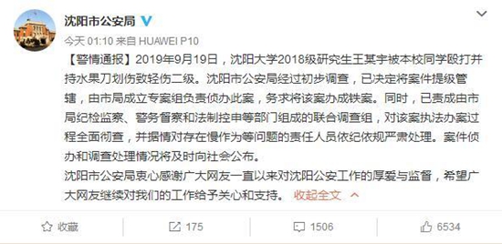 辽宁省沈阳市公安局官方微博19日发布警情通报称,2019年9月19日,沈阳大学2018级研究生王某宇被本校同学殴打并持水果刀划伤致轻伤二级。沈阳市公安局经过初步调查,已决定将案件提级管辖,由市局成立专案组负责侦办此案,务求将该案办成铁案。