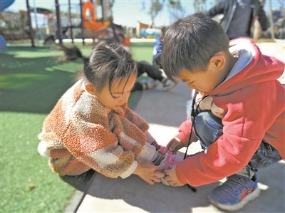 云南省大理州祥云县下庄镇中心幼儿园的孩子在帮同伴系鞋带 (罗雅/摄)