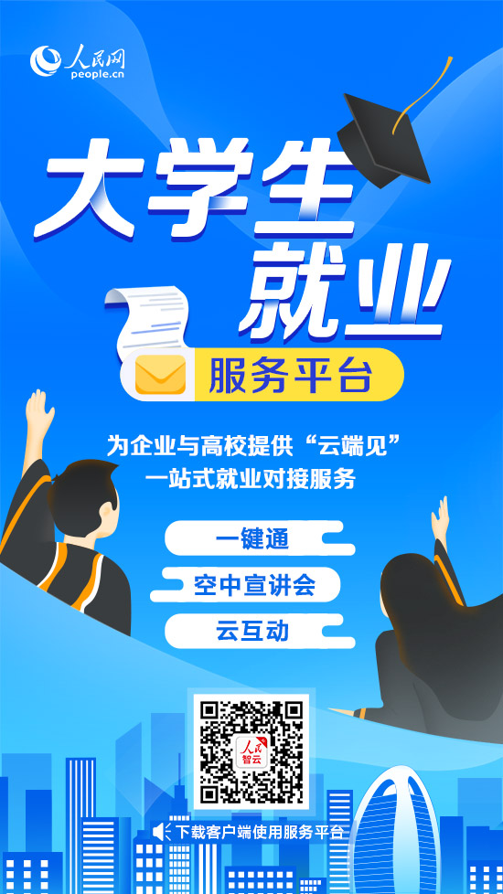 扫描二维码下载人民智云客户端,打开“校招”频道,使用大学生就业服务平台