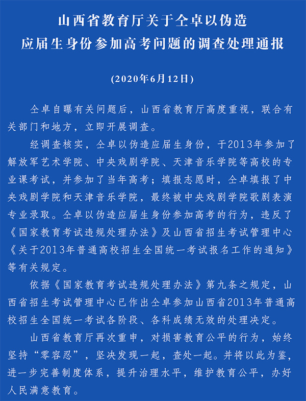 山西省教育厅通报:仝卓以伪造应届生身份参加高考成绩无效