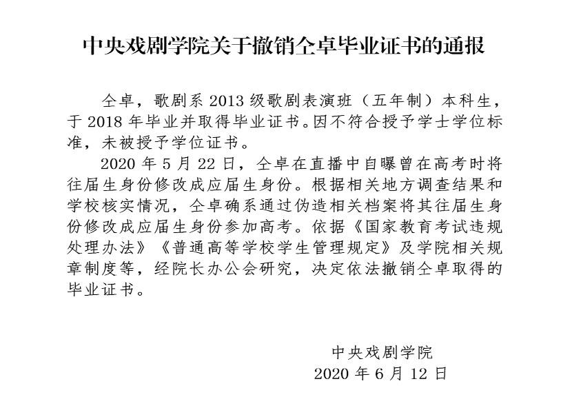 伟德国际1946bv官网北京6月12日电(李依环)近日,艺人仝卓在直播中自曝“曾在高考时将往届生身份修改成应届生身份”一事,引发广泛关注。中央戏剧学院今天正式发布通报,因不符合授予学士学位证书标准,未授予仝卓学位证书,并依法撤销其毕业证书。