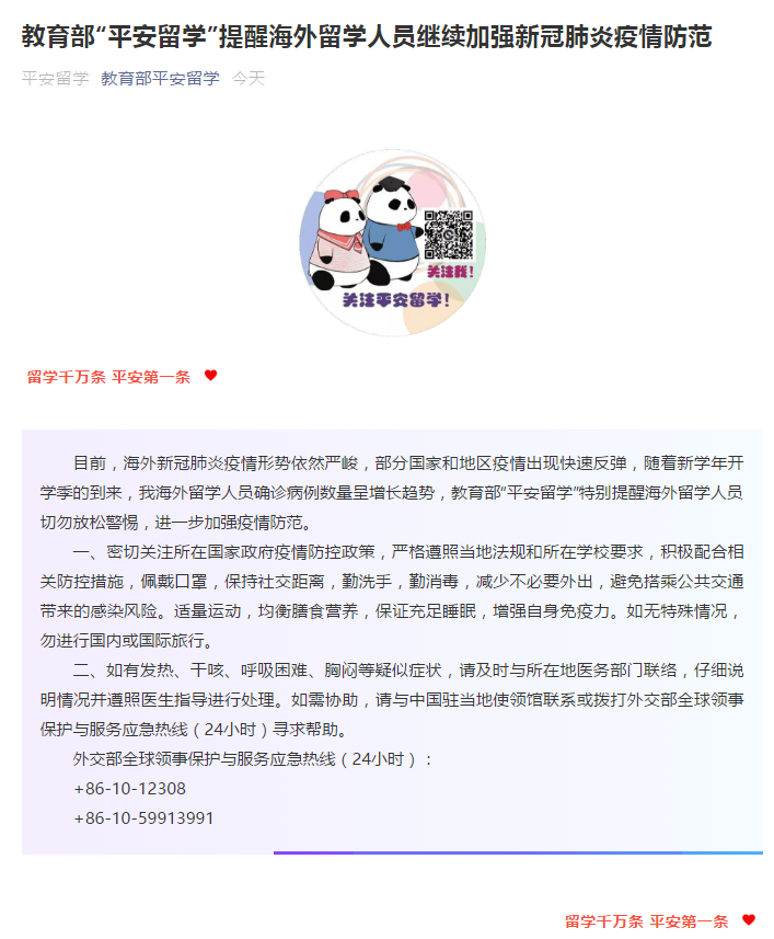 目前,海外新冠肺炎疫情形势依然严峻,部分国家和地区疫情出现快速反弹,随着新学年开学季的到来,我海外留学人员确诊病例数量呈增长趋势,教育部“平安留学”特别提醒海外留学人员切勿放松警惕,进一步加强疫情防范。
