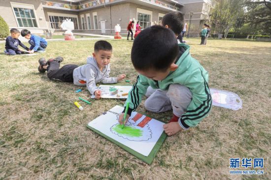 3月30日,小朋友在中国儿童中心内用彩笔和树枝树叶等材料“画春天”。