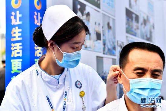 5月20日,在山东国际会展中心,济南护理职业学院学生进行耳穴压豆技能展示。