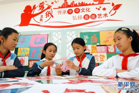 5月26日,青岛市即墨区通济街道山东小学的学生在制作剪纸作品。