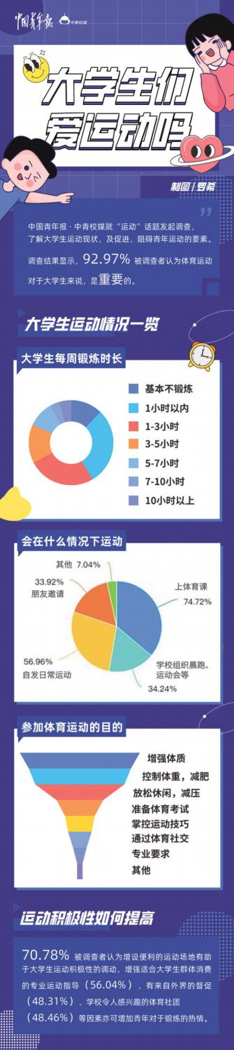 中青校媒调查显示,大学生认为,便利的运动场地(70.78%)、专业的运动指导(56.04%)、来自外界的督促(48.31%)等,能够提高他们的运动积极性。