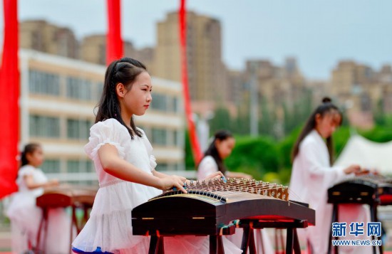 5月31日,在呼和浩特市赛罕区敕勒川绿地小学腾飞路校区,古筝社团学生在音乐节上演奏乐曲。