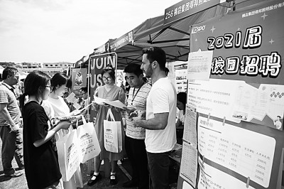 图④2021年5月,江苏淮安,大学生在校园招聘会上挑选工作岗位。