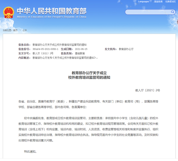 伟德国际1946bv官网北京6月15日电 (记者孙竞)今天,教育部宣布成立校外教育培训监管司。