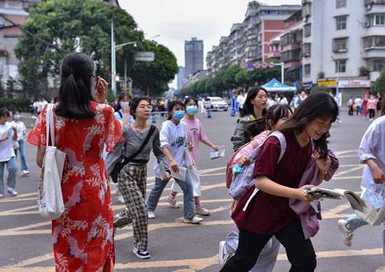 6月7日上午,高考考点门口,学生们准备进考场,一名老师身穿红色旗袍送考。
