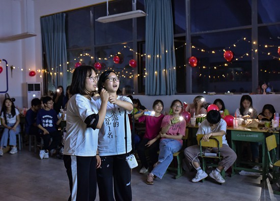 6月8日晚,高考结束后,班上组织了联欢晚会,同学们在一起唱歌。