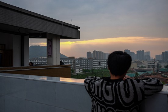 4月8日傍晚,天际出现了一道晚霞,我的一名学生在走廊里向远处看去。