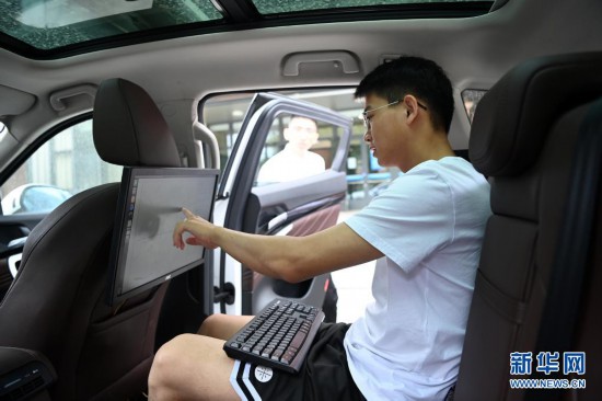 天津大学智能与计算学部的学生在调试自动驾驶车辆的数据(6月16日摄)。