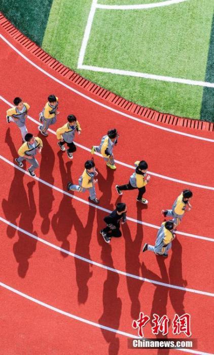 河南省栾川县狮子庙镇中心小学,学生们在新的塑胶运动场上上体育课。中新社记者 贾天勇 摄