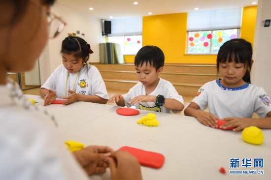7月14日,在成都市武侯区龙腾社区,小朋友在做泥塑。