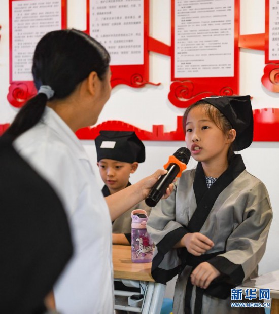 7月14日,在成都市武侯区竹园社区,志愿者向小朋友提问中医知识。